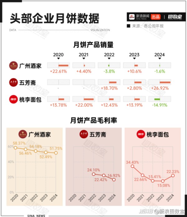 广州酒家的月饼产品维持着超过50%的高毛利率,但销量增长已显著放缓;五芳斋则以牺牲利润为代价冲刺销量,其毛利率在三年间从24.1%降至16.92%;桃李面包则呈现出另一种挑战,其销量在2024年大幅下滑14.91%,尽管毛利率有所回升,整体仍面临增长压力。