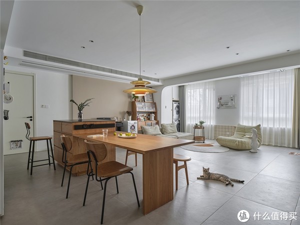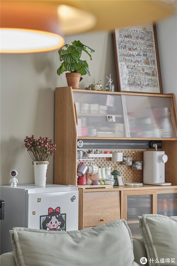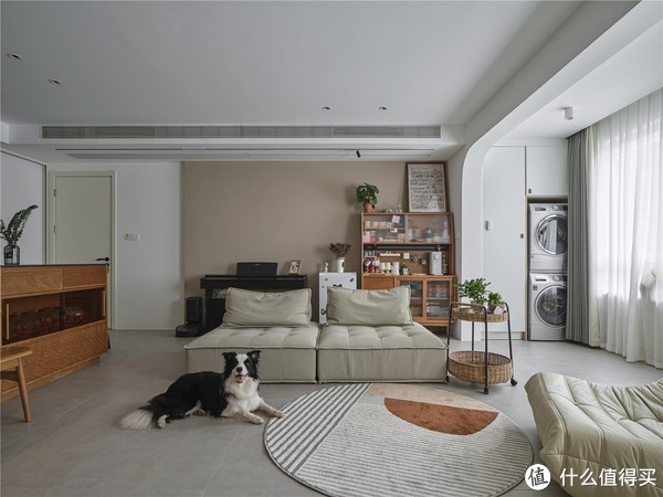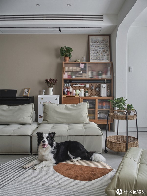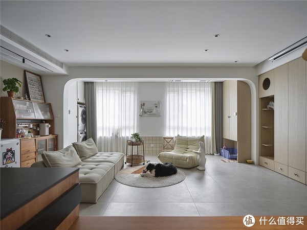 或许也会出现类似这样的声音:没茶几怎么放茶杯,如果有客人来了,总不能让客人一直把杯子拿在手里吧,这是很不礼貌的一种行为。但是想想一年又有多少个客人来家里,我想真实的生活应该是这样,你家客厅的茶几有多大,上会就会堆放多少杂物。当然,对于装修,我都是遵循着以舒适感和需求至上,根据自身的需求及生活习惯去设计布局,扩大空间功能性。但是为啥还是有越来越多人不要茶几,看完她家我彻底领悟了,原来是真这么舒适。