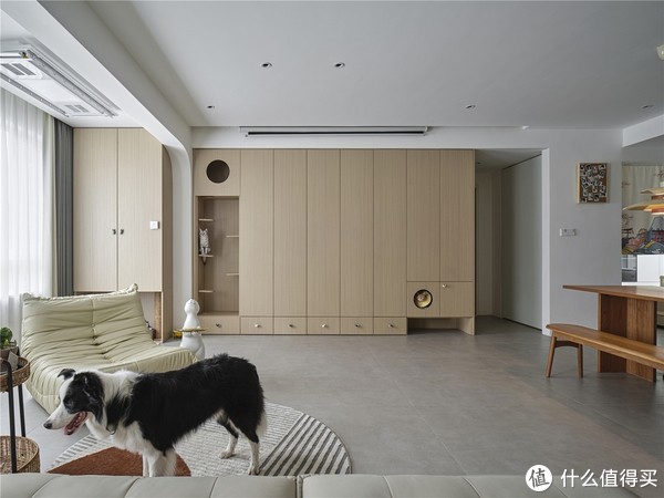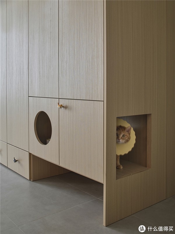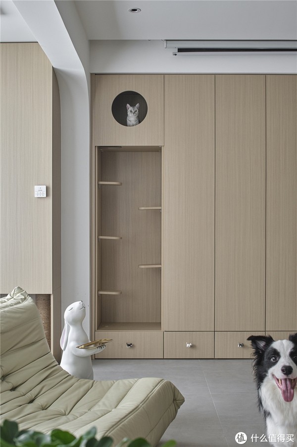 传统的那种在沙发前面放个大茶几的摆设,在这里显然不见了,释放出开阔的空间铺张地毯更适合逗猫,等以后有了小孩,还是小朋友玩耍的重要区域。甚至还把电机柜请出家,采用多功能的收纳柜,内部构造更是出奇的实用,用木色板材定制的猫爬架、家居用品收纳柜、猫洞的组合,构建一个人与宠的和谐生活空间。
