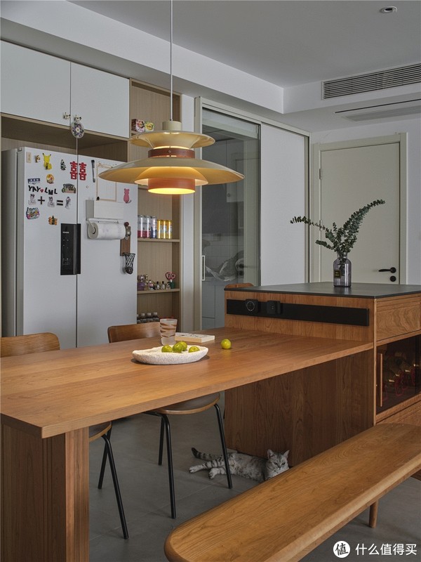 所以在看完她家我真是彻底悟了,弱化客厅功能,把与亲朋好友的社交放在餐厅,真这么舒适。而且中岛餐桌的功能特别强大,是沟通交流的吧台,还是操作台,而餐桌也是办公桌等,功能大大超过客厅,客厅也就是一家人偶尔看场电影而放。