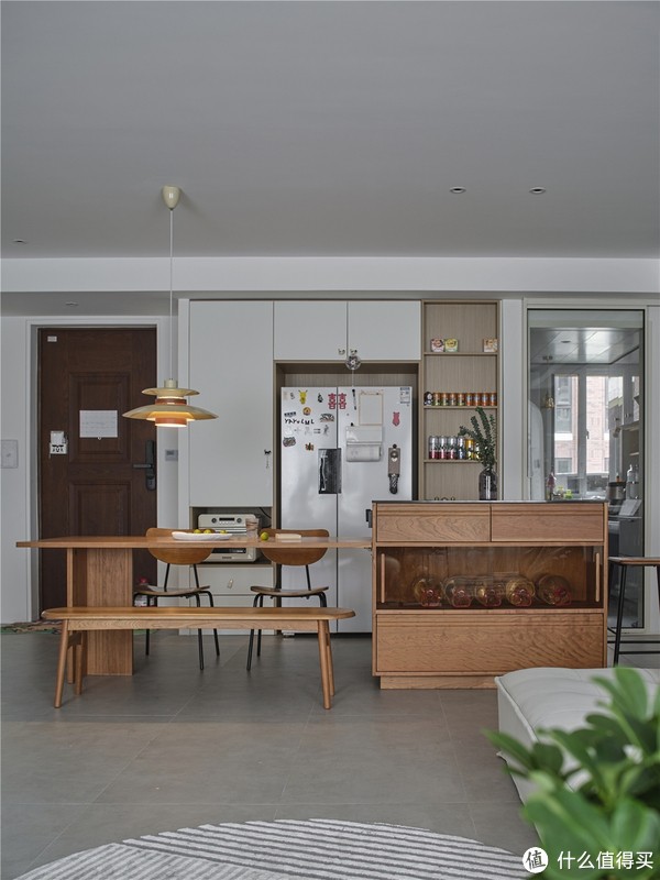 入户门的右边墙,定制一整排的收纳柜,同时还把大冰箱挪动到这里,看过平面图的朋友会知道,把原来的冰箱位置移到这里,是为了调整主卧室房门,这样才能得到一个更加开阔的沙发背景。