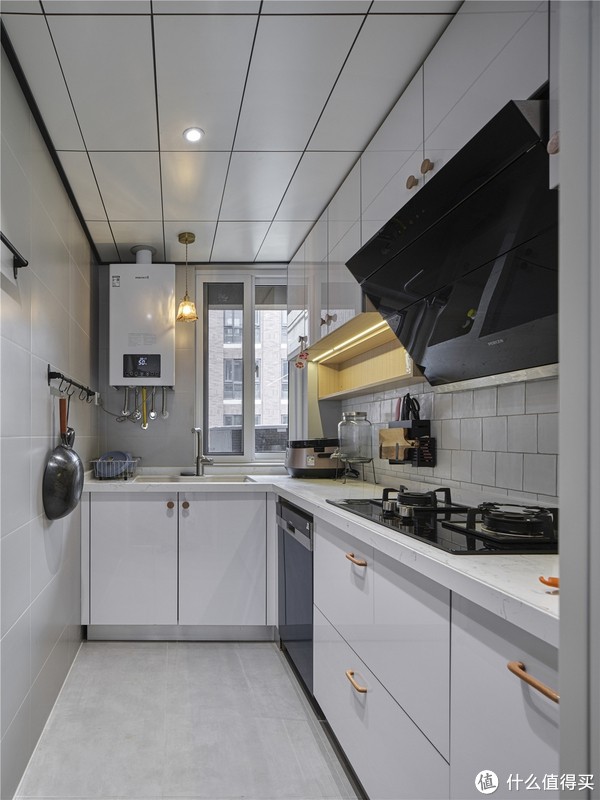 虽然厨房是小了点,但很实用。我看到不少细节,整体还是白色为主,看着很简洁干净,除此之外,还有个实用的地方就是洗手盆上面装了个吊灯,因为年轻夫妻晚上回家,在此洗茶有些背光,装个好看的吊灯除了提升空间颜值,还很实用,所以我们不仅是不要让烹饪区背光,清洗区也要亮堂。还有利用墙面空间,定制了一个开放格,以后可以放调料瓶,别说这能让台面显得更加整洁。
