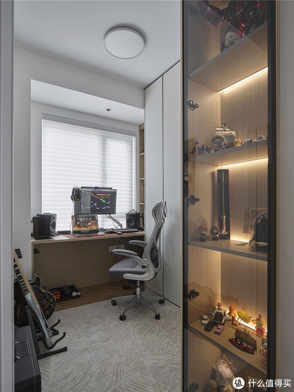 一个释放压力的空间,有游戏机还有可爱的手办收纳柜,利用灯带的装饰,将氛围感给拉满。