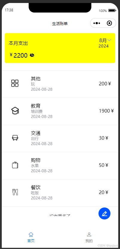 Springboot +vue +uniapp生活记账小程序,前端采用vue uni-app设计开发,后端采用 Springboot 开发前端对应的数据接口,首页显示生活账单信息,我的野蛮统计记账信息和微信登录状况。记账页面可以,根据不同类别的日常消费记账,数据库mysql 缓存redis ,