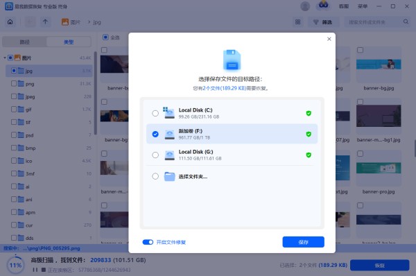 步骤4.选中需要恢复的图片后,点击“恢复”,选择需要保存的位置(注意不要保存到源盘D盘,避免数据被覆盖),并“开启文件修复”(软件在保存过程中恢复自动修复损坏的图片),随后点击“保存”。