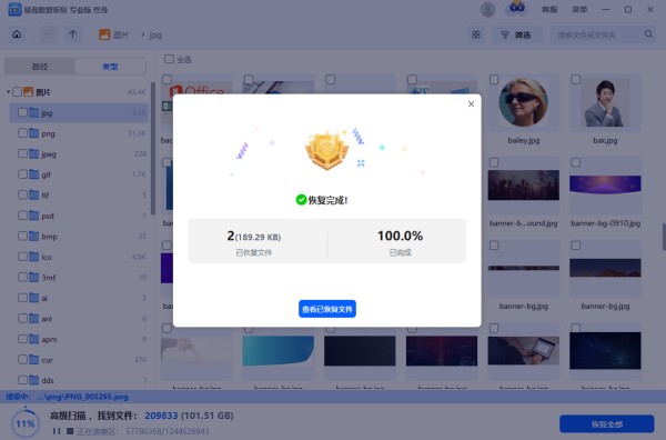 步骤5.等待保存完成,点击“查看已恢复文件”可以查看恢复的图片是否无误。(如果在操作过程中遇到任何问题,可以直接点击右上方“客服”寻求咨询帮助。)
