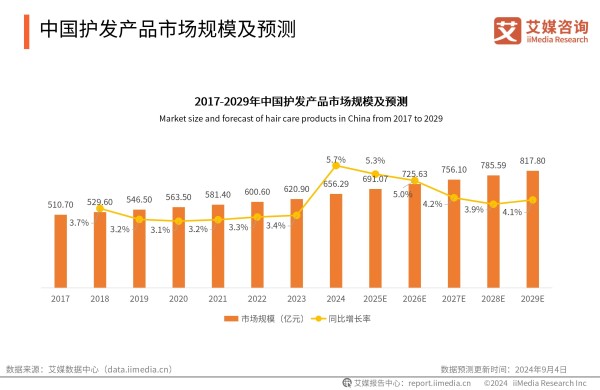 自二十世纪70年代护发素进入中国至今,消费者的护发意识经历了从“产品普及”到“科学护理”的迭代,护发产品市场渐趋成熟。iiMedia Research(艾媒咨询)数据显示,2024年中国护发产品市场规模达到656.29亿元,同比增长3.4%,预计2029年将达817.80亿元。“护肤式护发”理念兴起,产品需求从单一功能(如柔顺、去屑)向防脱、控油、抗敏等细分场景延伸,推动行业向精细化、高端化转型。