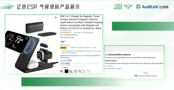 同样地,长期占据亚马逊3C保护类产品销量榜首、拥有超过8000万用户的ESR亿色,也积极为其众多产品争取气候绿标认证。下图展示的是ESR亿色的一款手机支架产品,该产品已成功通过CF认证获得了气候绿标。