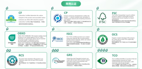 亚马逊目前认可52种不同类型的认证方式,卖家的产品只需获得其中一种认证,即可获得气候绿标的资格。目前常见的认证包括CF、CP、GRS、FSC、OEKO、ISCC、RCS、TC、OOCS等,其中最受欢迎的是CF认证和CP认证。