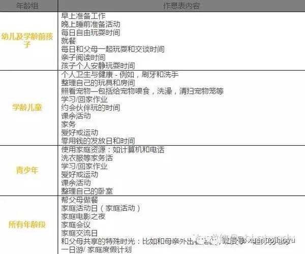父母和孩子在制作日程表时,可以根据孩子年龄考虑加入以下一些项目,供大家参考。
