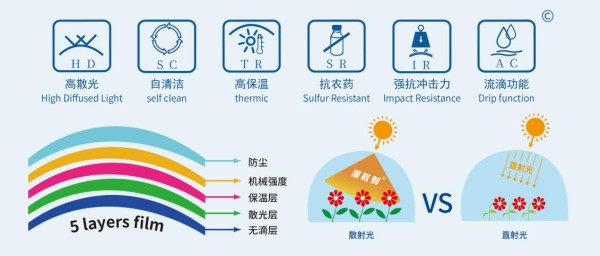 雷马系列农膜产品以漫散射®技术为核心,维持92%充足透光率的同时,能将强直射光线转化为柔和均匀的散射光,既保证作物获得充足光照,又有效避免了因强光直射导致的叶片灼伤问题。目前漫散射®技术已经获得专利认可,被广泛应用在雷马系列专用膜产品之中。