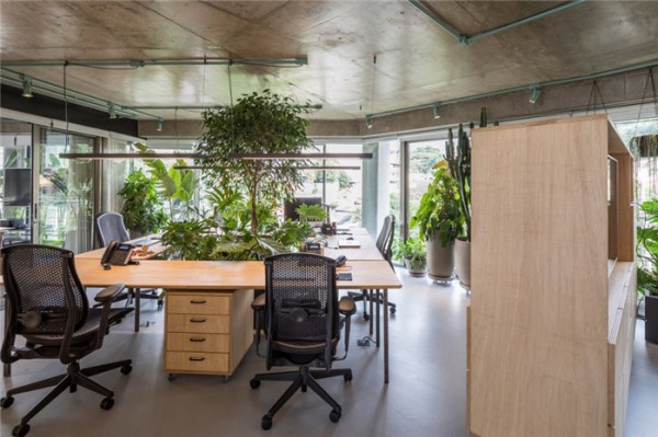 该案例选择在办公室装修中选择刷绿色或者木纹色的墙漆,这样就仿佛身处大自然的绿色之中,顿时就感觉身心舒适了呢?选择在办公室装修时摆放一些绿植,或者是墙体装饰,或者是桌面装饰,在提供绿色的同时也可以净化空气,岂不是一举两得。除此之外呢,设计师还在办公室装修时选择绿色系的地毯,当然这里就要和自己办公室装修风格相一致,不然就会有失美观。当然,如果你喜欢的话也可以选用一些类似森林中的草地般的地毯。铺设了绿草一般的办公室地面让人有种想要坐下野餐的感觉,当然也不要忘了为办公室的装修风格要与之相对应。这样的办公室设计简直是让人欲罢不能呢!