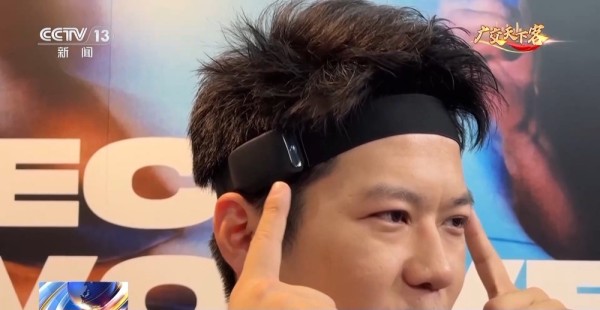记者头上像发带一样的装置是一个头戴式蓝牙耳机,它采用了定向传音技术,音乐只能自己听见,不会影响到他人。