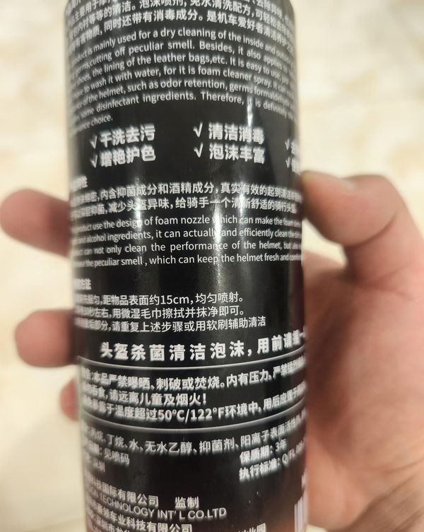 从我到重庆骑车的话,也有六七年了吧。都是用的这个品牌的泡沫清洗剂。用了也有十多瓶了吧。夏天用得比较勤,没办法。带的全盔,哪怕有头套呢,汗水还是会浸入头盔内衬。下车往尾箱一放,里面的味道就自己都忍不了,何况有时候后座还坐人呢,这不臊得慌啊