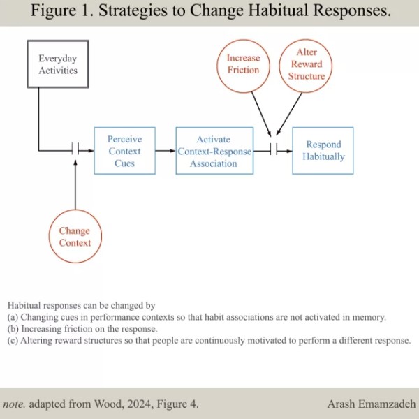 习惯使我们能够自动完成经常做的动作,例如烹饪熟悉的食物、下班后开车回家、在健身房锻炼等。但不良或不健康的行为(如用嘴呼吸、挖鼻孔、暴饮暴食、久坐不动)也可能成为习惯。而且,我们都知道,养成好习惯和改掉坏习惯都具有挑战性。在本文中,我将讨论伍德(W. Wood)发表在 2024 年 8 月号的《心理科学最新方向》(Current Directions in Psychological Science)上的一篇论文,该论文评估了关于有效习惯养成和习惯改变的最新研究,并介绍一些行之有效的策略。