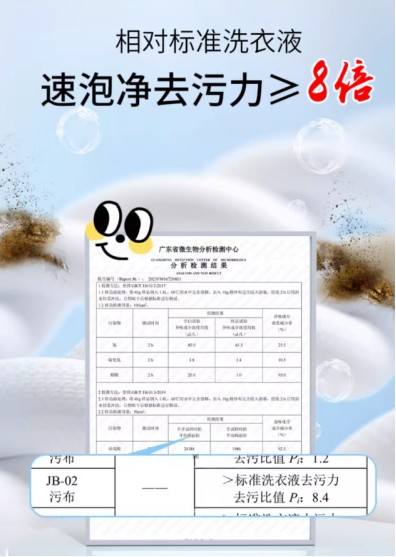 按照传统方式,家长需要先用专用皂手动搓洗,再倒入洗衣液机洗。而现在,只需将“速泡净”溶于50℃左右的温水,浸泡15分钟,让活性氧分子深入纤维分解污渍,再直接投入“洁净大师洗衣液”启动常规洗涤。整个流程一气呵成。更重要的是,经过第三方权威检测,产品组合实现了零荧光剂、无碱性残留,真正达到了母婴级安全标准,让每一位父母都能安心使用。