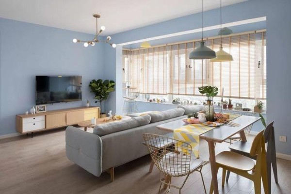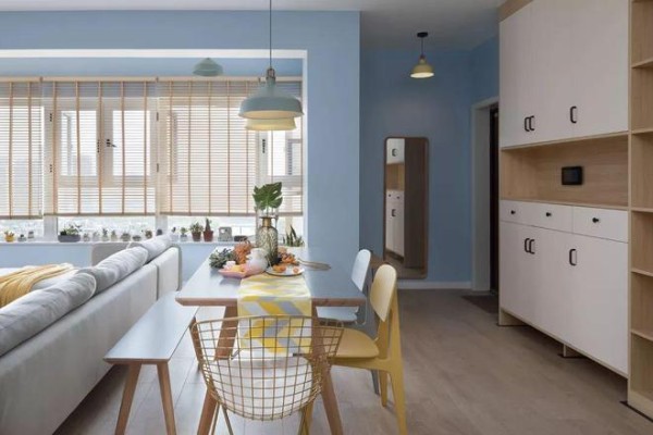 客厅和餐厅之间没有做隔断,沙发的后方就是餐桌椅。整个空间都被刷成了蓝色,让人感觉非常有小清新感,窗台上的绿植摆设也带来了自然感。