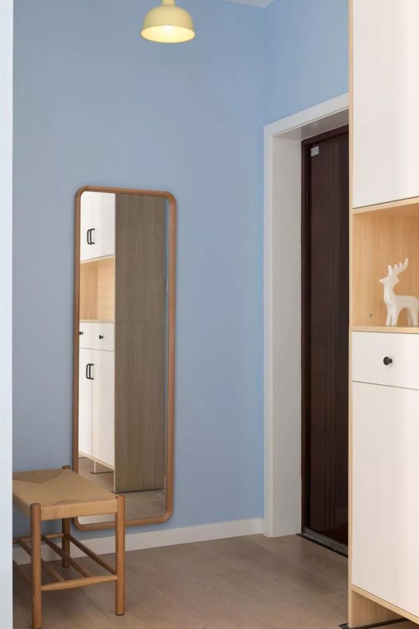 入户玄关处摆放了换鞋凳和穿衣镜,让屋主出入更换鞋子、整理仪容都会更方便。天蓝色的墙面让这个空间显得更为清新。