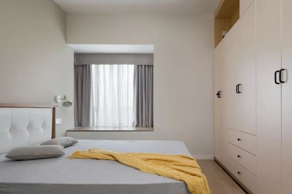 主卧室的衣柜被放在了床尾,藕粉色的柜门看起来更加浪漫。卧室也是以暖色调为主,搭配浅灰色的床品,温馨而又轻松。