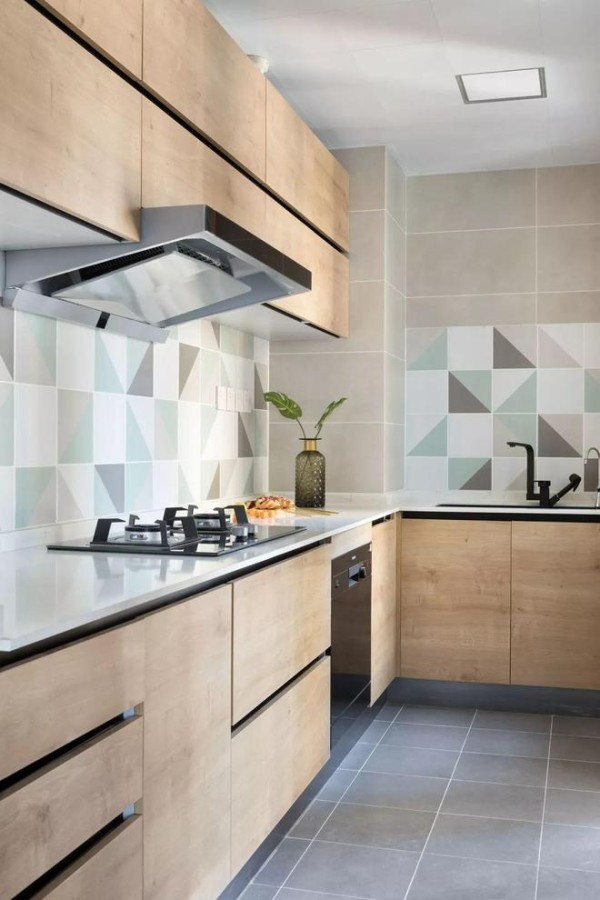 厨房内部做了L形的橱柜布局,橱柜和吊柜之间的墙面,铺贴了彩色的几何图案瓷砖,让厨房看起来更加有趣一些。