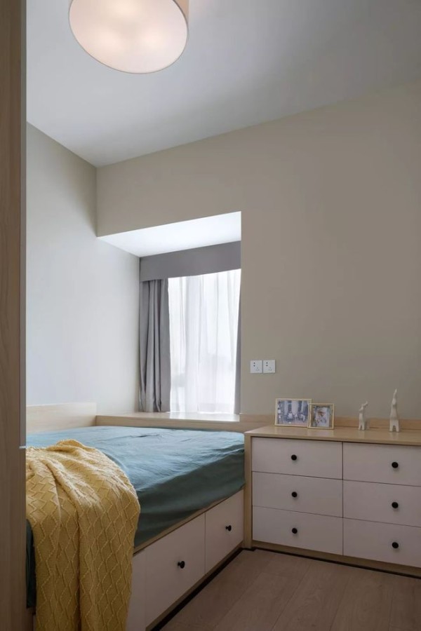 次卧做了榻榻米床组合柜子的设计,没有睡人的时候就可以当作储物间来使用,定制的榻榻米床拥有更多的储物空间。
