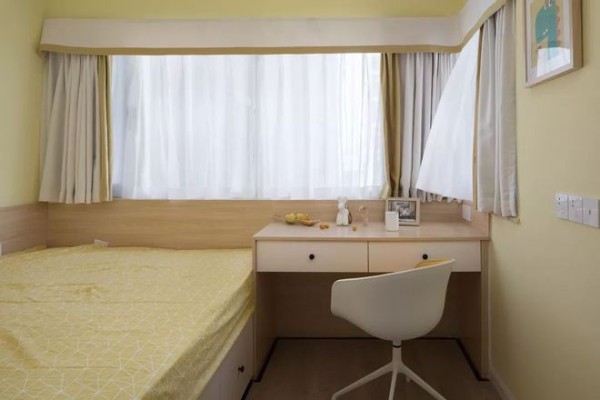 儿童房的床也是做了榻榻米床,书桌和床结合起来。用书桌代替床头柜,也是为了孩子之后做作业更方便。