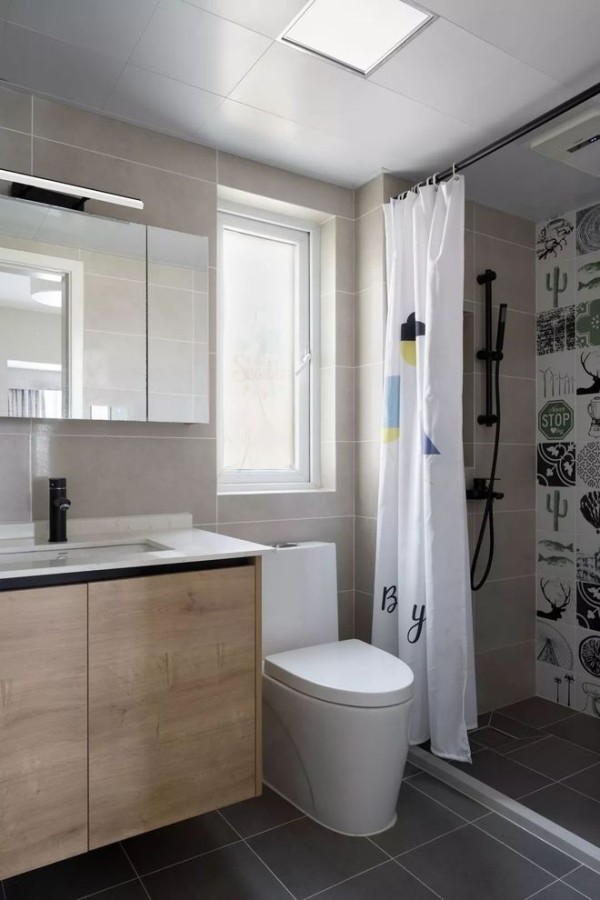 卫生间内用浴帘和挡水条做了干湿分离,浴帘和淋浴区内的花砖给卫生间增添了一些趣味性。一字形的布局方式,把长条形卫生间的空间,充分利用起来。