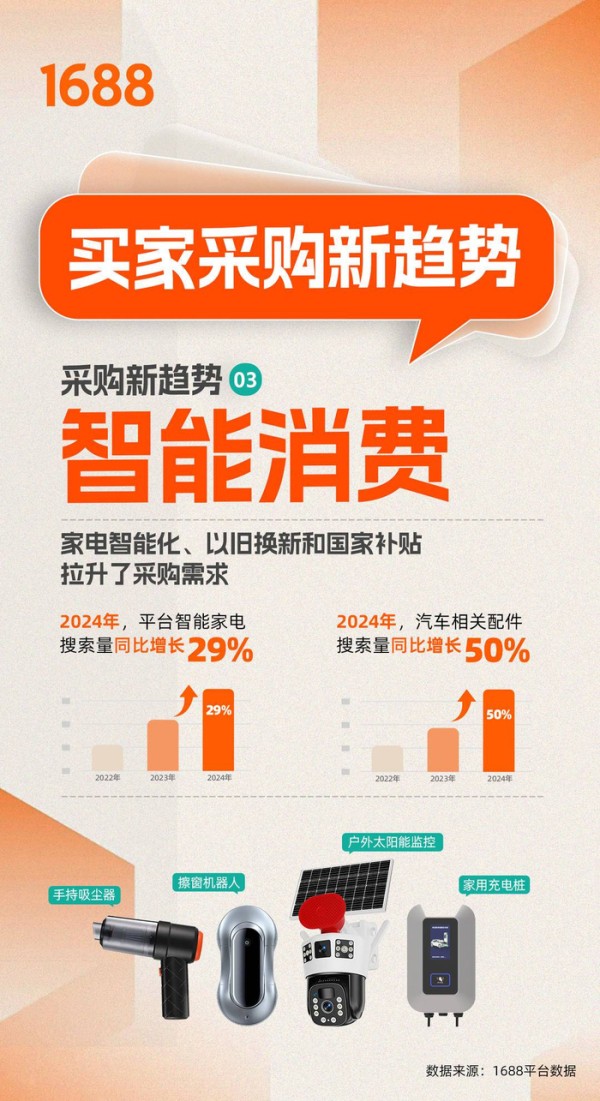 家电智能化、以旧换新政策和国家补贴的多重因素推动,显著拉升了采购需求。2024年,平台智能家电的搜索量同比增长了29%,其中“擦窗机器人”、“投影仪”、“手持吸尘器”、“洗地机”和“喷墨打印机”等品类最受消费者欢迎。