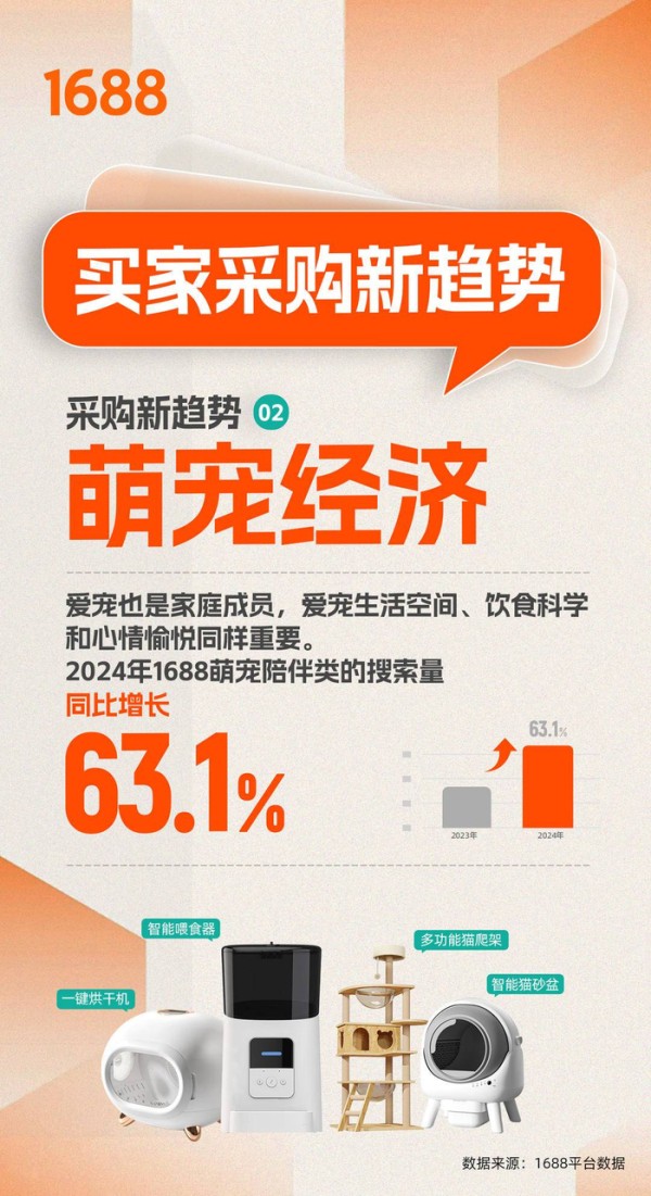 有趣的是,一些海外买家对集躲避屋、洞道等功能于一体的宠物“别墅”需求旺盛。2024年,“萌宠陪伴类”商品的搜索量同比增长了63.1%。