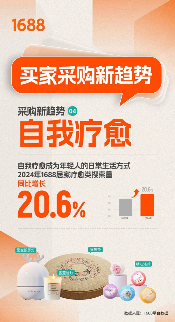 随着越来越多的年轻人选择通过嗅觉和视觉的疗愈方式来缓解压力,“香薰蜡烛”、“精油扩香仪”、“星空投影灯”、“精油浴球”和“冥想垫”等“居家疗愈类产品”逐渐成为热销产品。2024年,平台“居家疗愈类商品”的搜索量同比增长了20.6%,反映出这一细分市场正快速崛起。记者在1688平台搜索发现,光是泡澡用的浴球就有干花、精油、牛奶等等各种成分和五颜六色的美丽外观,甚至还有甜甜圈和蛋糕等各种形状,十分吸睛。