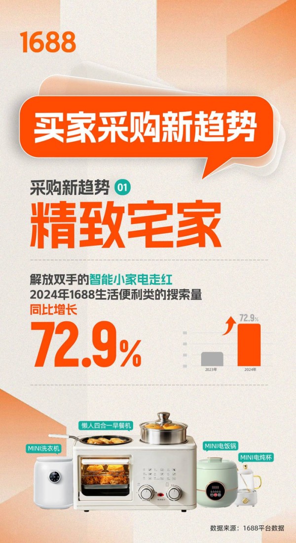 1688数据显示,2024年生活便利类商品的搜索量同比增长了72.9%。科技赋能让宅家健身更加专业和高效。如今,“AI健腹轮”、“甩脂机”、“智能哑铃”和“筋膜环”等设备成为热门选择。平台数据显示,2024年科学健康管理类商品的搜索量同比增长了97.4%。