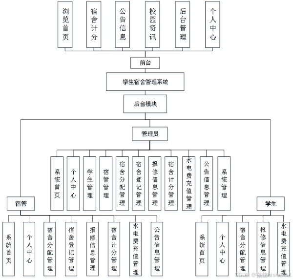 课题主要分为三大模块:即管理员模块和学生、宿管模块,主要功能包括:宿舍分配、宿舍登记、报修信息、宿舍计分、水电费充值、公告信息等;