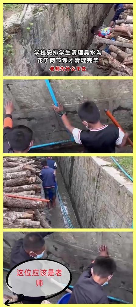 网上有一段视频,一群五六年级~七年级模样的学生,在学校的要求下,正在清理臭水沟。