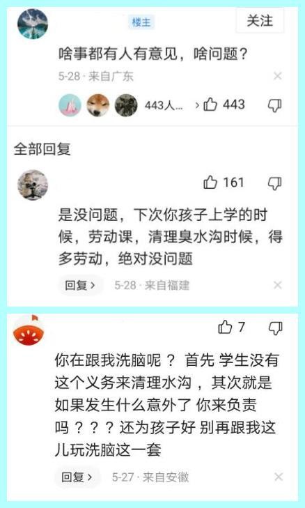 不过反对的网友马上就跳出来怼道,等轮到你孩子被安排上劳动课,清理臭水沟的时候,别人也会认为绝对没问题。