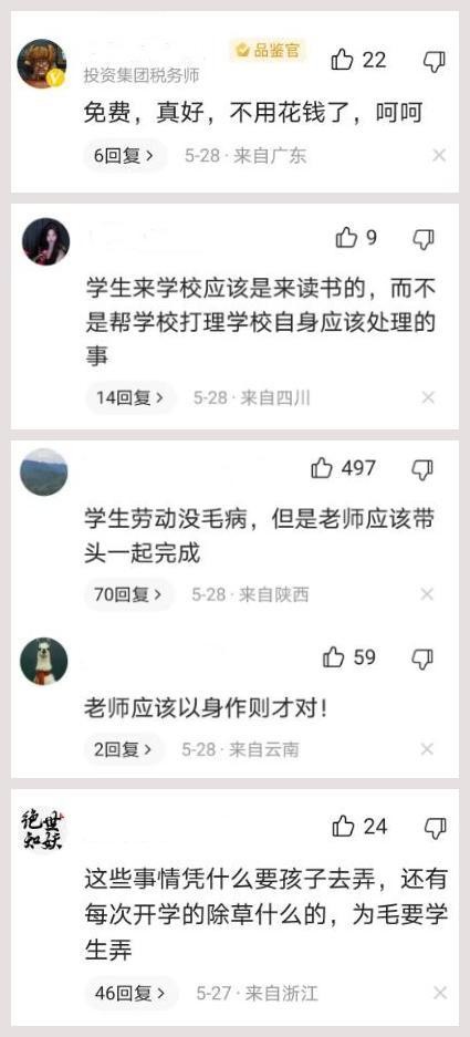 有网友说,学校这是把学生当成免费的劳动力,不用花钱请别人来处理;也有网友说学生是来学校读书的,不是来帮学校干活的;还有网友认为,老师也应该带头,一起完成(说老师没有参与的网友,他们明显就没认真看视频,在视频的一段画面里,有位寸头看起来有些老成的人,应该就是位老师了)。