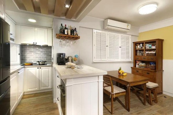 这个足够宽的半墙成为岛台后,下方可用来储物,让原有的L型厨房,变成了U型厨房,搭配墙面的刮板,还多了一个操作台。