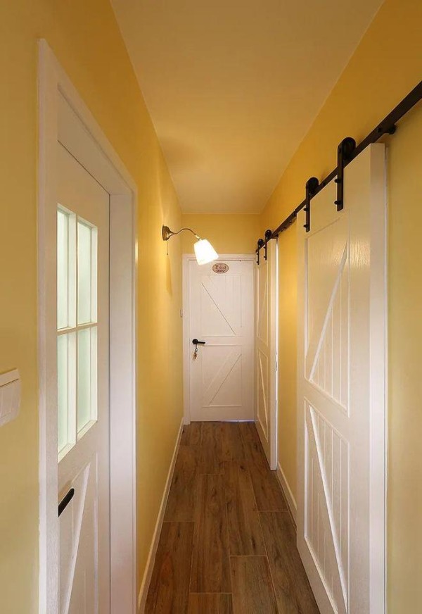 为了区分空间,卫生间用的是传统的玻璃+木门,而两个卧室则采用了和入户门一样的“谷仓门”造型,进入主卧也是谷仓门,其中一扇是可以移动的,一扇用来装饰。
