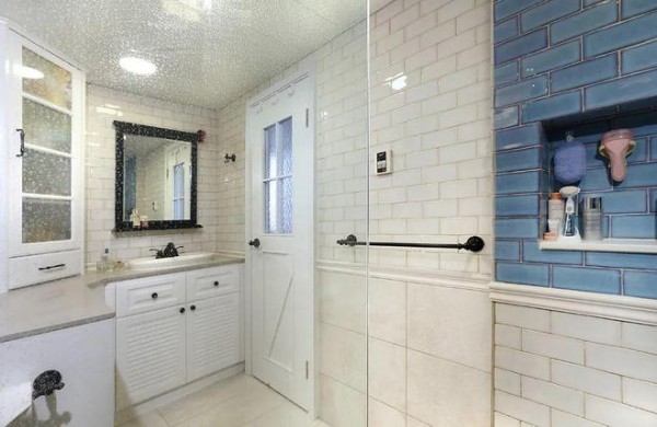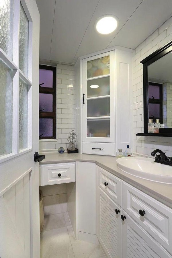 卫生间也是贼小,靠墙面转角的地方,设计师做了玻璃平开门,用来存储卫生间常用的手纸之类的物品。