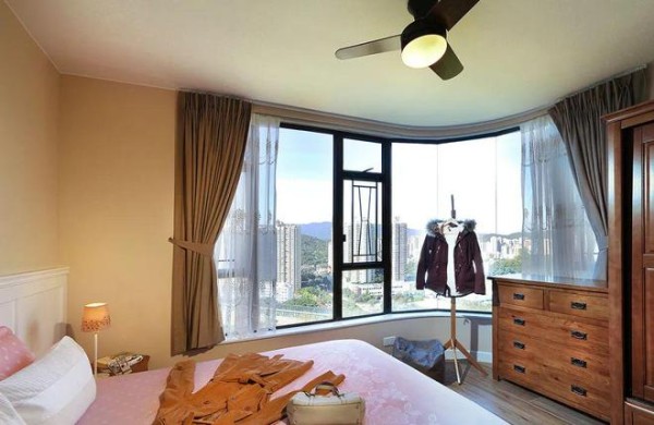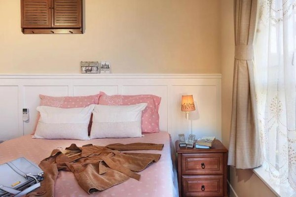 主卧用嫩粉+暖黄做装饰,温馨少女,很适合入眠,窗边超大的L型飘窗用来做化妆区、阅读区都好。