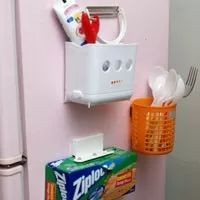 直接到9元店或某宝寻宝也是一招!现成的磁铁收纳商品种类繁多,笔筒型放调味料之类小东西,夹夹型可以夹住纸盒面纸、锡箔纸等,直接往冰箱壁面一贴就搞定!