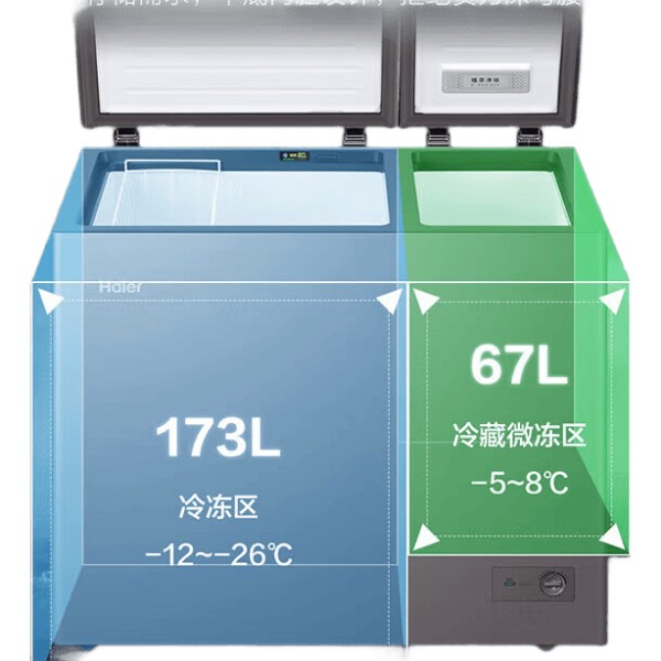 海尔双温冰柜,冷藏微冻室容积67升,冷冻室容积173升,标准耗电量仅为0.53Kw.h/24h,冷冻能力达到7.5Kg/12h,产品尺寸为940*620*865mm,温度范围广泛,从-26℃到8℃,可以满足您多样化的储存需求。