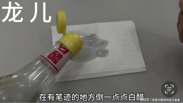 再来试一试手上的这个笔记,也是反复的擦都没有任何的作用,这个时候垫一张纸巾,在有笔迹的地方倒一点点白醋,这个方法是我在网上找到的,据说用白醋就能把它去除,用白醋我们再反复的擦一擦。我反复的擦了好久,感觉只是变淡了一点,根本没有去除。