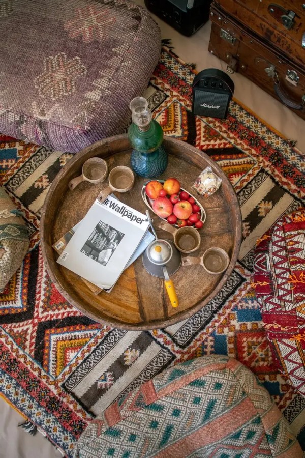 “葡萄美酒夜光杯”,苍茫风光映衬着曾代表中卫乡村民居传统的夯土平房,搭配丝路特色的挂毯、老物件,组成有强烈辨识度的形象符号——“黄河·宿集”一度被媒体和粉丝称为“东方摩洛哥”。