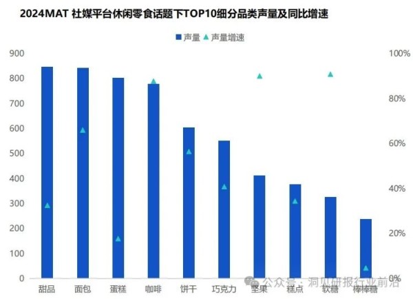 休闲零食品类高度分散,社媒平台休闲零食话题下品类提及数量达到1500个以上,甜品、面包、蛋糕声量较高。