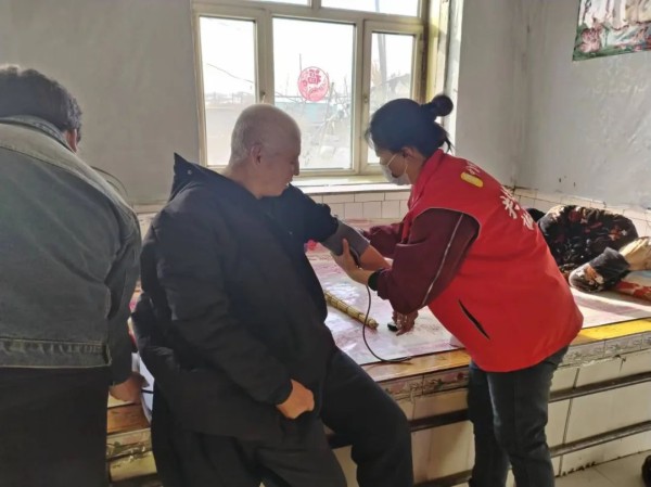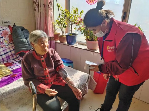 “大娘,您别动,我给您测个血压。您这血压还是有点高,平时得多注意饮食,以清淡饮食为主,注意油和盐的摄入量。如果您感觉到不舒服的时候,随时打电话叫我。”永安镇“老有所依”志愿服务队正在为永安村金淑芹老人开展居家养老服务。