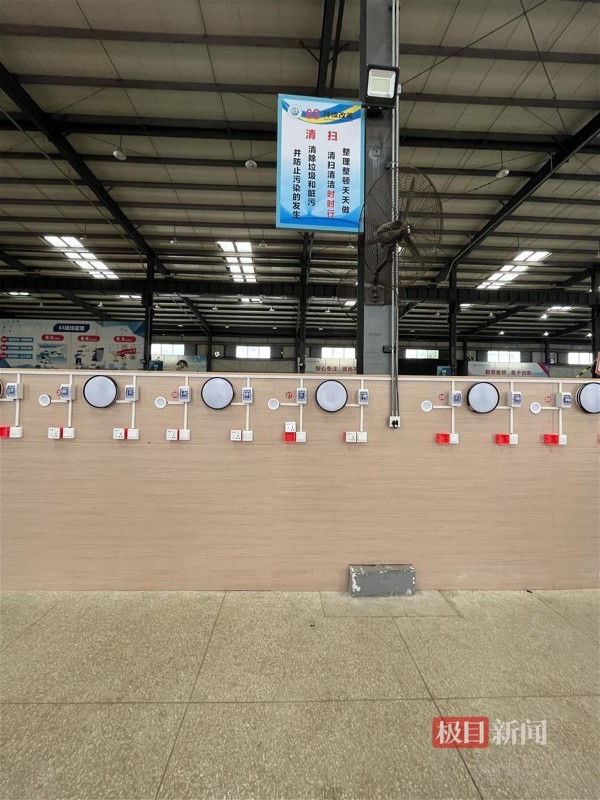 尚技楼是武汉铁院用于钳工、电工培训的场所,极目新闻记者在现场看到,偌大的实训室被分割成了不同的区域,进门向左拐,便能看到装有吸顶灯、射灯的照明电路罗列成了一排,照明电路区的对面则是装有马桶、水龙头的水路故障维修区。