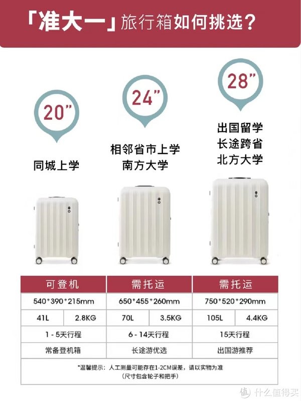 留学的朋友不用说,28寸大尺寸箱子必不可少,建议额外在备一个20寸,以便国外日常使用;长途跨省的姐妹们,尤其学校在北方城市的。建议28寸,毕竟9月的北方城市已经开始转凉啦,秋冬的衣服比较厚,会比较占空间。