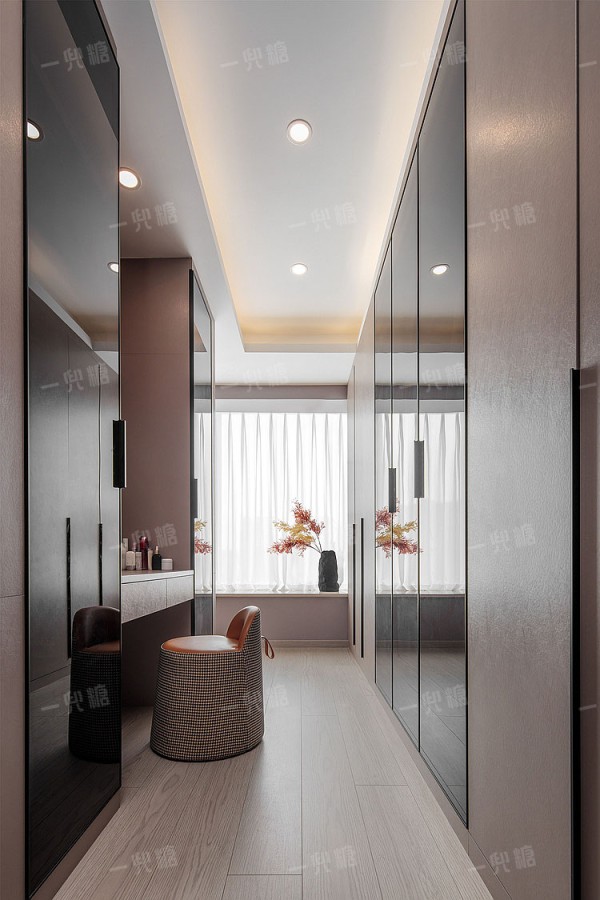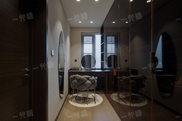 为了最大化利用空间,一般呈U型或Ⅱ型,主要是满足衣帽间需求,可活动空间较小,也有把梳妆台嵌入的设计,让换衣梳妆能够在一个空间里完成。