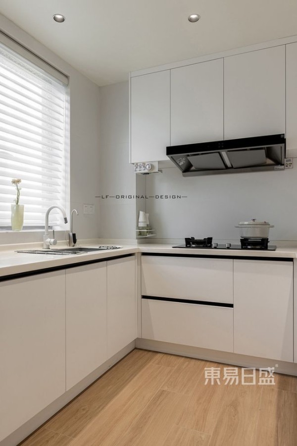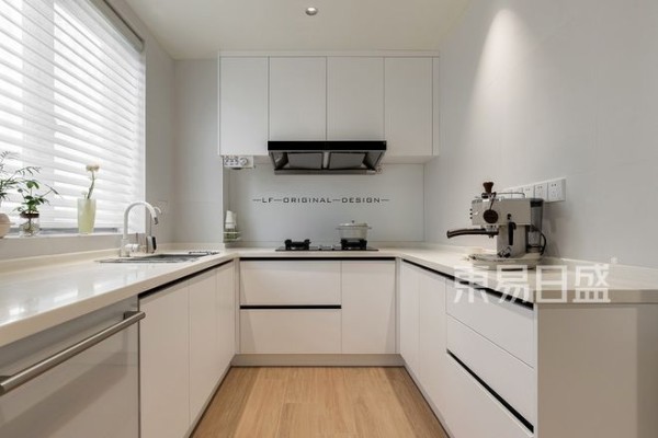整个厨房都采用了白色的设计,显得非常的清爽干净简洁,辅以原木色地板,不显单调。