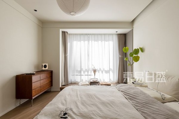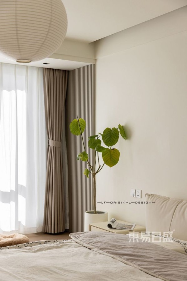 随动线进入卧室空间,主卧延续客厅原木与石材的运用,大大的落地窗,与大自然亲密接触感受魅力,阳光照射进来仿佛整个居室被包裹着,营造出温馨柔和的睡眠环境,搭配清新的绿植净化空间。